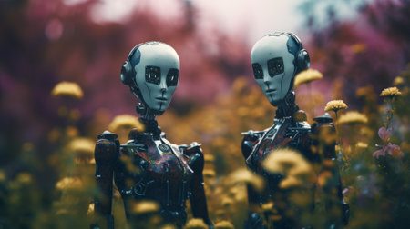 Illustration of robots in a flower garden. Generative AI