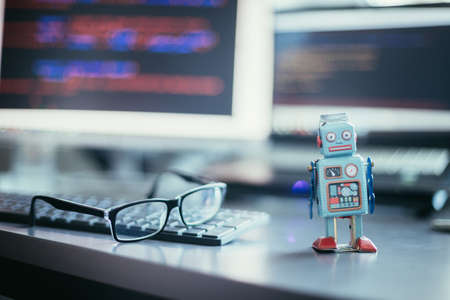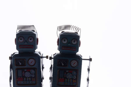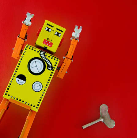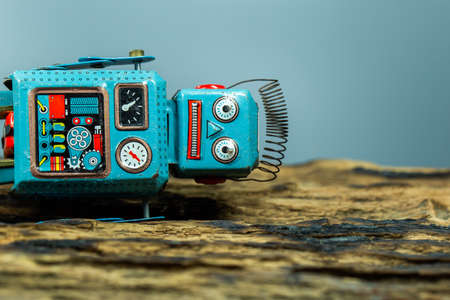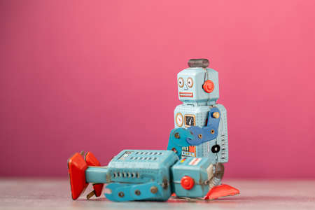 Vintage tin robot toy isolated on colorful neon background with copy space