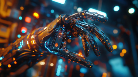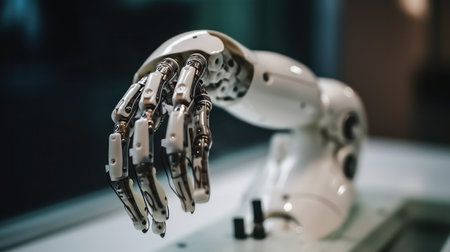 detailed robotic hand, showcasing advanced technology and precision, highlights the intersection of art and artificial intelligence