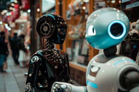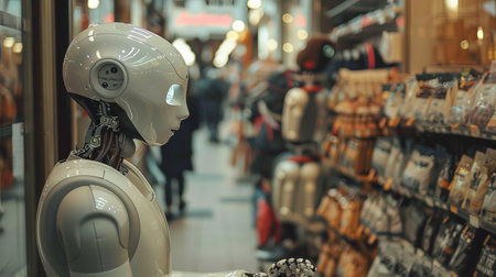 A humanoid robot with a lifelike head stands ready to assist in a busy retail store, representing the fusion of AI with customer service.
