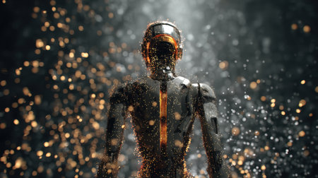 A stunning futuristic robot figure emerges from a cascade of shimmering particles, representing the intersection of technology and creativity in a captivating scene.