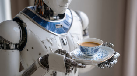 A humanoid robot elegantly serves coffee in a beautiful china cup, showcasing the intersection of technology and daily life in a modern setting.
