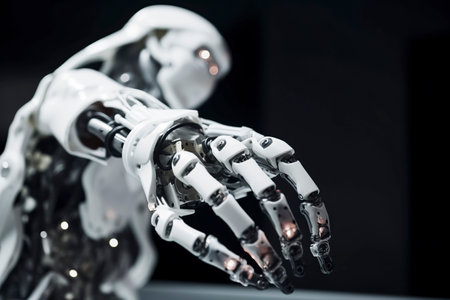 detailed robotic hand, showcasing advanced technology and precision engineering, against a dark background