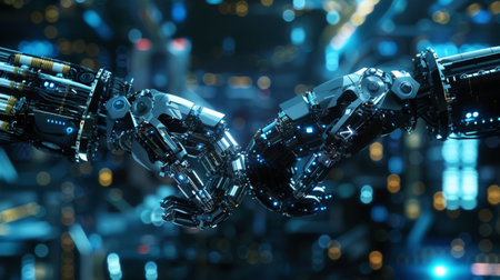Two robotic arms shaking hands, representing collaboration and partnership in technology. Symbol of futuristic cooperation.