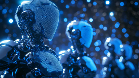 A trio of sleek, futuristic robots stands in close formation, their reflective surfaces glistening under a sea of vibrant blue lights, embodying advanced technology and innovation.
