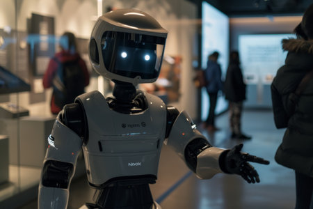 An intelligent robot acting as a guide in a museum, pointing out exhibits to curious visitors, representing the intersection of culture and AI