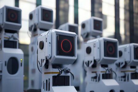 Advanced robotic devices equipped with cameras monitor the urban surroundings at twilight, showcasing technology.