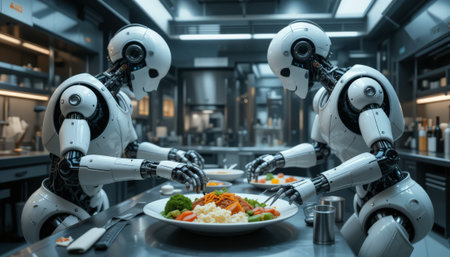 AI-powered robotic arms handling food processing in a futuristic automated kitchen, digital transformation in food industry with copy space.