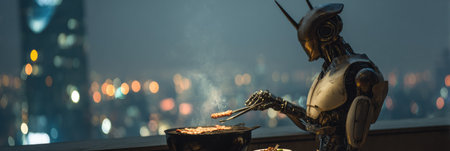 A futuristic robot barbecues kebabs on a rooftop grill. City lights blur in the background during nighttime.