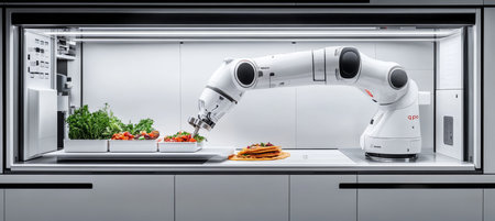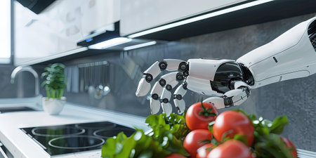 Robotic arm preparing vegetables in a modern kitchen. Advanced culinary technology and AI.