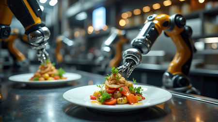 Robotic arms are precisely preparing a gourmet shrimp and tomato salad on plates in a gleaming commercial kitchen, showcasing automation and innovative food technology for culinary industry applications.