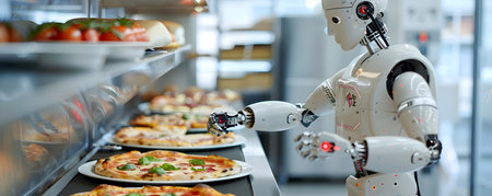 Robotic chef using a digital scanner to inspect and ensure the and perfection of a freshly baked pizza in an automated food process