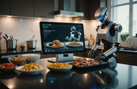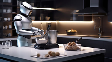 High-tech robot chef preparing gourmet meal in modern kitchen. Advanced AI and robotics in home cooking and food preparation.