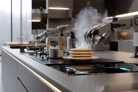 Robotic arms cooking pancakes in a modern kitchen symbolizing the future of automated home technology.