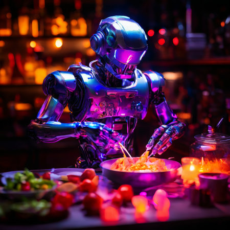 Robot chef preparing gourmet dish in a vibrant kitchen