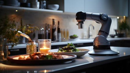 A robot chef skillfully arranges various dishes in a contemporary kitchen during dinner time.