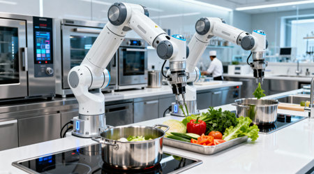 Two robotic arms work in a professional kitchen, preparing fresh vegetables for cooking