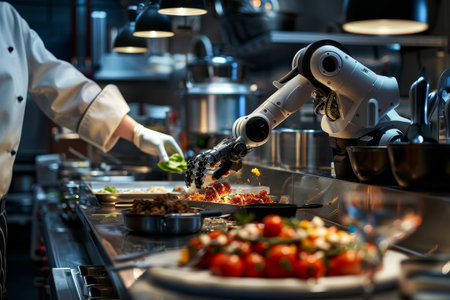 Robotics in Culinary Robot Chef Prepares Appetizers in a Modern Restaurant Kitchen Setting