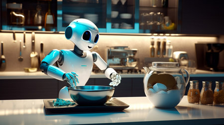3d rendering humanoid robot mixing ingredients in a bowl on the kitchen