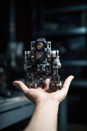 shot of a robot and a human hand in front of the camera, created with generative ai
