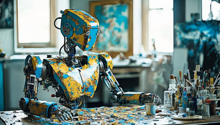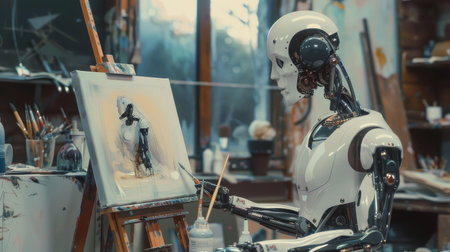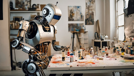 A sophisticated robot engages in painting within a messy artist studio, surrounded by scattered art supplies.. AI Generation