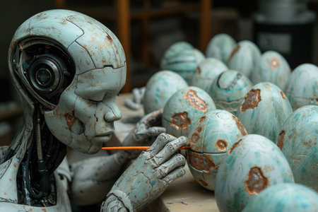 A robot with a humanoid head paints an Easter egg, standing at a table in a workshop among unpainted eggs