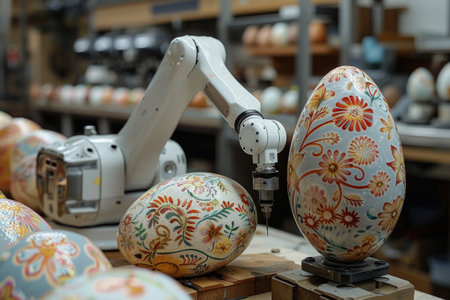 A white robotic arm intricately adorns a large Easter egg with traditional floral patterns, bridging old-world charm and new-world technology. AI Generated.