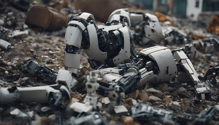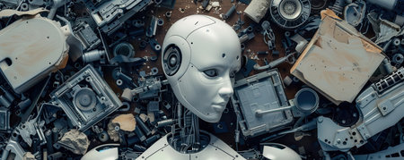 A futuristic robot head among scattered electronic waste, exploring themes of technology and disposal in a modern context.