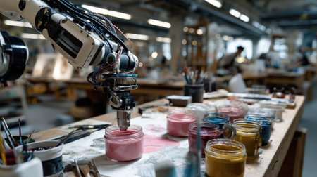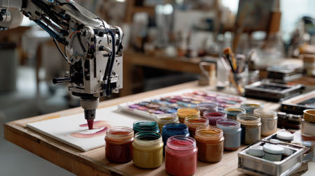 A robotic arm expertly paints with vibrant colors in a modern art studio. Surrounded by paint jars and various art tools, it embodies innovation in creativity.