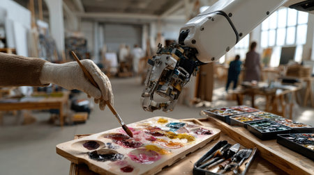 A robotic hand assists a human artist in a vibrant studio, showcasing the intersection of technology and creativity in the world of art.