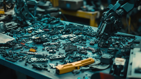 A close-up view of a workbench filled with mechanical parts and tools, showing a robotic hand meticulously organizing industrial components in a workshop environment.
