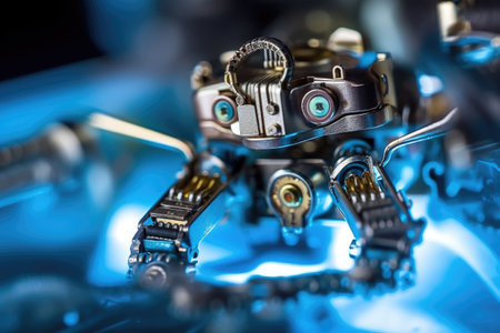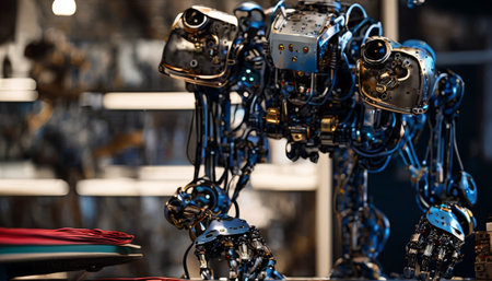 Detailed shot of intricate blue robots featuring complex mechanics, displayed in an industrial setting with a focus on technology and craftsmanship.. AI Generation