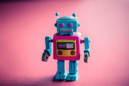 A pink and blue toy robot on a pink surface. Generative AI image.