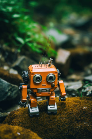 A toy robot sitting on top of a pile of rocks. Generative AI image.