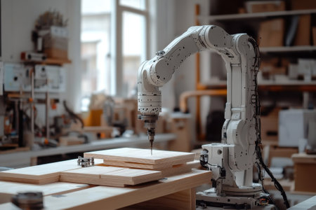 A robotic arm is precisely drilling holes into wooden panels in a well-equipped workshop environment.