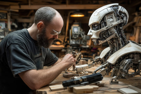An artist meticulously assembles a humanoid robot using various mechanical components in a well-lit workshop.
