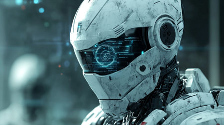 Close-up of futuristic robot head on blurred background. Selective focus.
