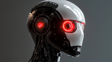 3d rendering humanoid robot head with red light on gray background.