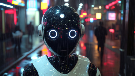 A sleek humanoid robot with a reflective visor is positioned amid the bustle of a vibrant city street.