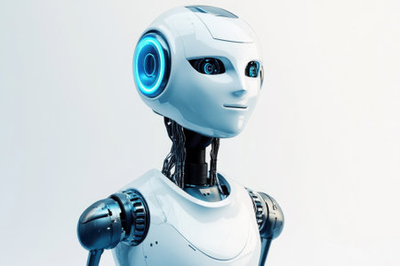 Sleek humanoid robot with glowing features stands out in a bright, detail-rich environment.