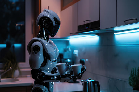 3d rendering humanoid robot working in the kitchen at night, artificial intelligence concept