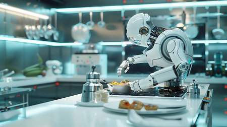 A humanoid robot chef expertly maneuvers around a sleek, modern kitchen, preparing a meal with state-of-the-art culinary equipment.