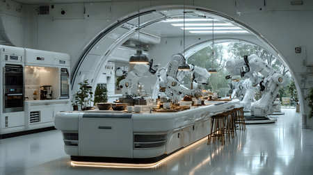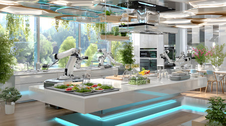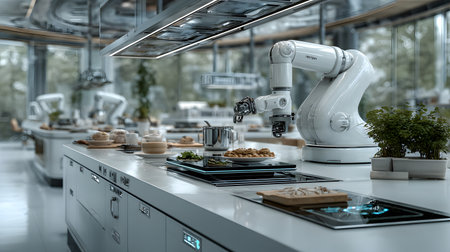 A sleek kitchen featuring a robot chef preparing gourmet dishes using advanced technology. Emphasizing modern design and smart cooking innovations.