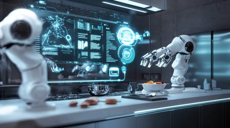 Robotic arm preparing meals in a futuristic kitchen with digital displays