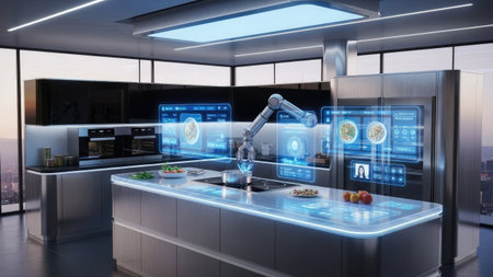 High-tech kitchen featuring robotic cooking arm, smart displays, and IoT-enabled appliances. Culinary technology and automation for modern home cooking. Tech innovation and smart home concepts.