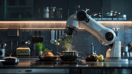 A cutting-edge kitchen robot expertly adding herbs to a simmering pot, illustrating the innovative future of home cooking