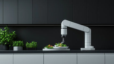A sleek kitchen robot prepares a vibrant salad on a dark countertop, featuring fresh ingredients and plants. This modern automation enhances cooking efficiency and aesthetics.