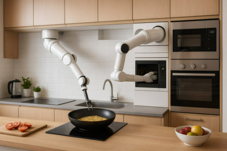 A modern AI-powered kitchen with robotic arms preparing meals in a clean and futuristic space. Ideal for smart home, kitchen tech, and lifestyle content.