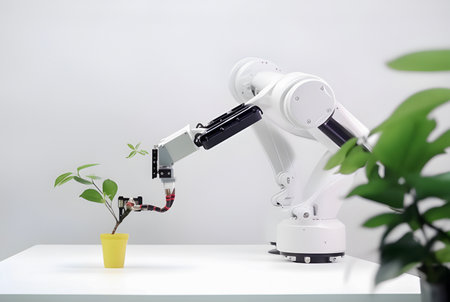 Robotic arm, robot farmer working in a lab with fresh green plants, white background. AI generated.