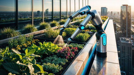 Futuristic robot is watering plants on a rooftop garden, showcasing the potential of automation in urban agriculture.